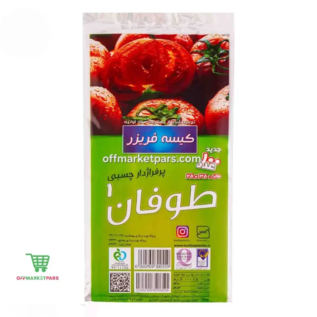 کیسه فریزر چسبی پرفراژدار طوفان با ابعاد ۲۵ در ۳۵ سانتیمتر، بستهای شامل ۱۰۰ عدد کیسه با کیفیت عالی و مقاومت بالا، مناسب برای نگهداری و فریز کردن مواد غذایی با سهولت باز و بسته شدن و بدون نشت مایع.